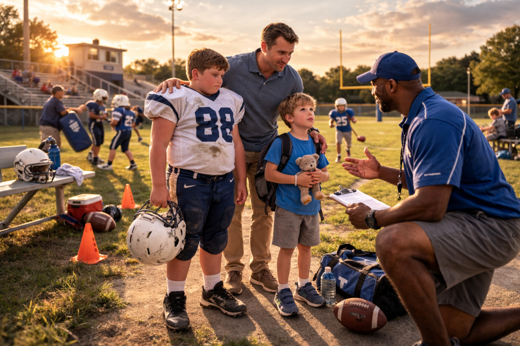 AI image depicting a father introducing his twin sons to a youth football coach, with the boys at noticeably different stages of physical development—one taller and fully geared up, the other smaller and more hesitant—illustrating natural variation in growth and readiness despite shared age and background.