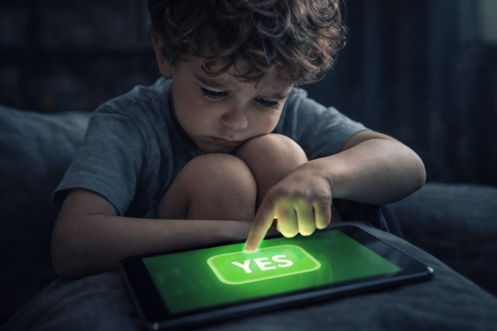 AI image depicting a withdrawn child reluctantly pressing a bright green “YES” icon on a tablet, the glowing screen contrasting with the child’s tense posture and downcast expression, suggesting compliance without enthusiasm or emotional readiness.