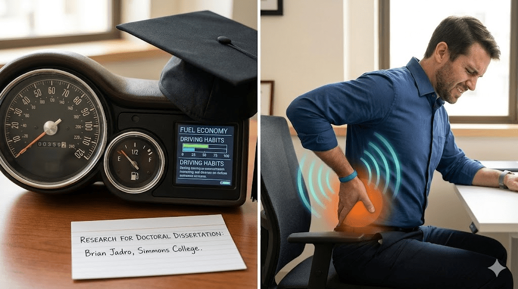 His 2017 doctoral dissertation, claims that despite greenhouse gases and climate change, drivers in the United States continue to operate vehicles that consume more fuel per mile and emit higher levels of greenhouse gases than the vehicles driven in other developed nations. He utilized a “treatment package” of specific targets and real-time dashboard displays to modify the driving behavior of three participants, to evaluate how to increase their fuel efficiency. His 2020 study applied similar behavior science principles to office ergonomics, applying a wearable device to provide vibrotactile feedback for six participants. In an office setting, real-time physical prompts significantly improved sitting posture and reduced low back pain. According to his experiment, the benefits were maintained even as the frequency of feedback was systematically reduced.